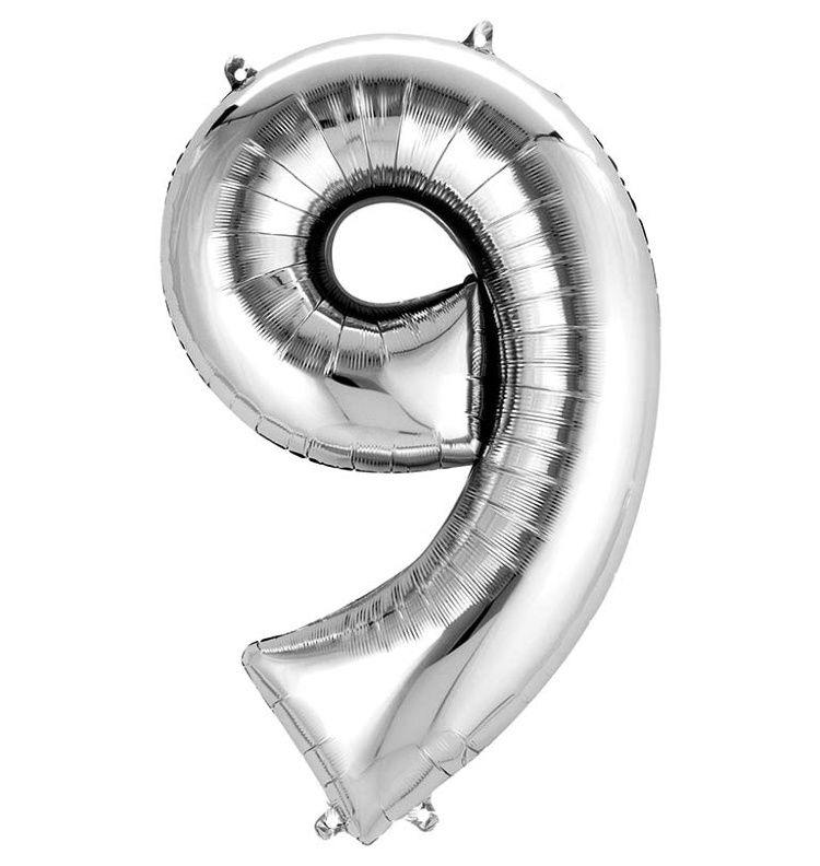 Шар наполненный гелием (40'' / 102 см) Цифра 9, Серебро.