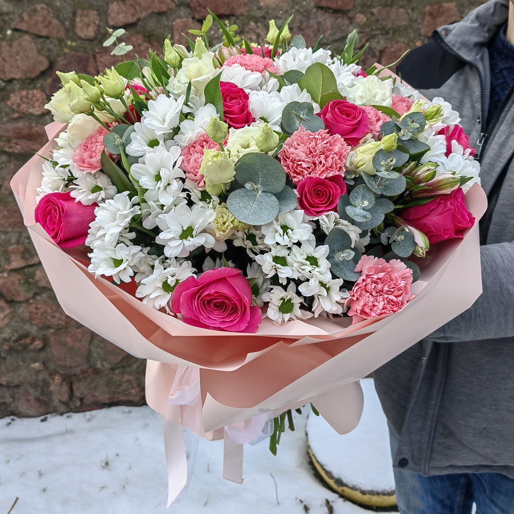 Воздушные нежно-сиреневые хризантемы с трогательным терпким ароматом — романтическая мелодия, созданная флористами. Композиция полна искренности, она напоминает о природной свежести, дарит приподнятый настрой.